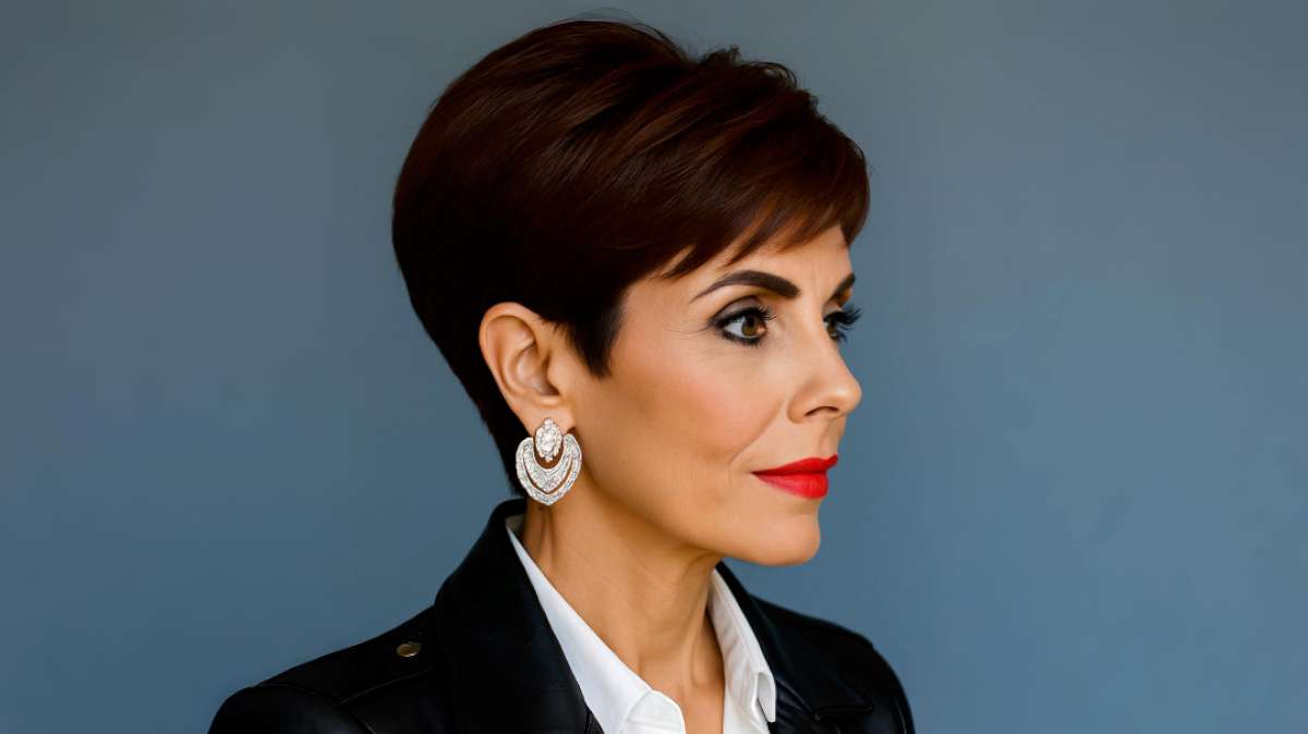 The dark pixie cut in this look is both modern and timeless. With its neatly trimmed sides and voluminous crown, it provides a sculpted silhouette that’s especially flattering for oval, heart, or angular face shapes. The hair’s smooth texture and subtle shine convey elegance, while the asymmetrical side fringe softens the look and adds depth. This style is ideal for professionals or women who prefer a clean, confident image with low-maintenance styling. Paired with bold earrings and a leather jacket, the cut transforms into a fashion-forward statement. Whether for everyday wear or an upscale event, this pixie cut blends class and edge with effortless grace.