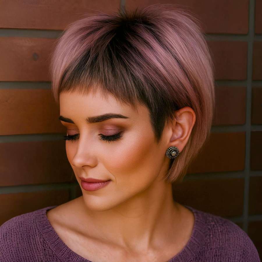 This hairstyle radiates harmony between softness and edge. The third image captures the fluid transition between muted rose and dark mauve hues, skillfully applied for a natural ombré effect. The side-swept layering enhances facial angles while maintaining volume at the top. The precision of the micro bangs adds personality, and the overall styling is neat without appearing stiff. It’s ideal for style-savvy individuals looking to express their creativity through hair while maintaining professional polish. Whether paired with vintage earrings or minimal accessories, this haircut delivers sophistication with a modern attitude.