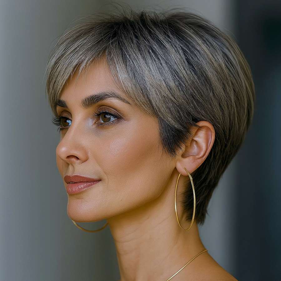 This pixie cut strikes the perfect balance between volume and structure. Viewed from a mild angle, the side-swept bangs lead into soft layering at the crown, offering natural fullness. The ash-silver tone provides a modern, upscale look that is both trendy and timeless. Perfect for women who want a low-effort style with maximum visual impact, this cut is wearable in all settings—from professional to casual. It works beautifully with oval, heart, or square face shapes and looks best when paired with minimal styling products that enhance shine and texture.