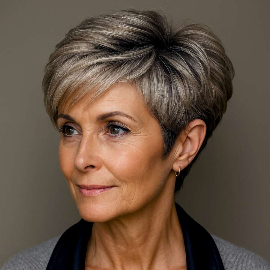 This voluminous pixie cut is the epitome of elegance and ease. Designed with carefully placed layers, it lifts at the crown while gracefully tapering around the ears and neckline. The side-swept fringe frames the face gently, softening facial features and offering a timeless, flattering look. Perfect for women who want a stylish yet manageable haircut, this style works best for those with fine to medium hair. The cool silver tones give it a contemporary edge while harmonizing beautifully with natural grays. Its low-maintenance design requires minimal effort but delivers maximum impact. This style is ideal for both everyday life and professional settings, offering a confident, put-together appearance.