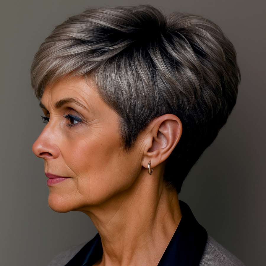 This side-profile view reveals the refined craftsmanship behind this pixie cut. The tapered neckline transitions smoothly into the fuller crown, balancing femininity with sharp definition. The ash-gray hue blends cool sophistication with natural charm, ideal for those embracing their silver strands. Best suited for mature women looking for a modern yet timeless haircut, this style flatters angular features and elongates the neck. The sideburn area is softly cut, ensuring a graceful outline with no harsh edges. This cut is both practical and fashionable—perfect for those who want a refined everyday look without the need for constant touch-ups.