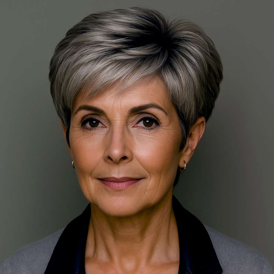 Front-facing, this pixie haircut reveals its expertly designed face-framing layers. The soft, feathered fringe highlights the eyes, while the structured top maintains a smooth, voluminous shape. The cool silver tones are strategically placed to add shine and visual movement. This hairstyle is particularly flattering for oval and heart-shaped faces. It provides a clean, youthful look that feels modern yet ageless. The uniform length across the forehead adds harmony, while the top layers give the hair lift and liveliness. It’s perfect for women who want a minimal yet impactful haircut that blends elegance with ease.