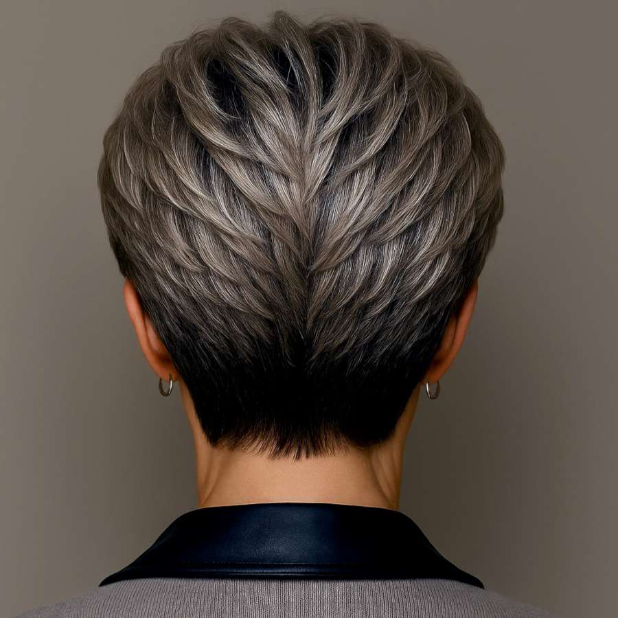 This rear view of the pixie cut highlights the artistry of its layered texture. The feathered strands cascade from the crown and converge in a subtle V-shape, showcasing skillful styling and a contemporary aesthetic. The dark roots give the lighter silver tones more contrast and definition. Ideal for those who appreciate detail and dimension in their haircut, this look keeps the back neat while allowing for fullness on top. It’s low-maintenance and air-dry friendly, making it an excellent option for active women who still want to look effortlessly chic. A stylish blend of practicality and elegance, this cut is great from every angle.