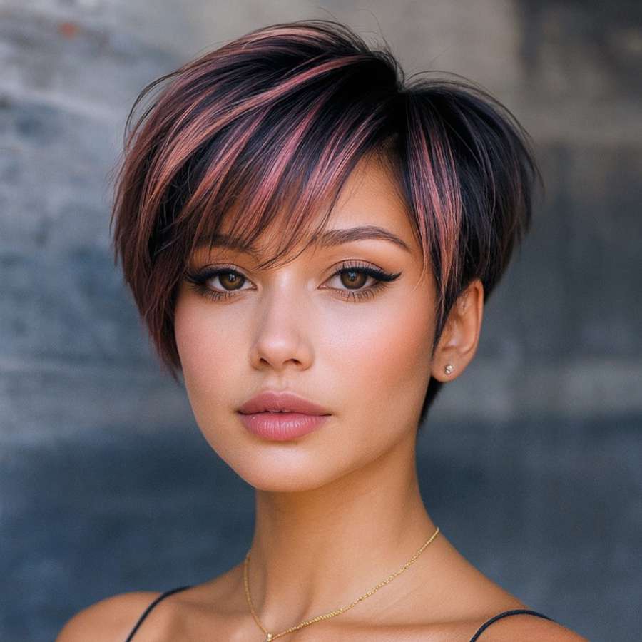 This bold pixie cut is a striking fusion of elegance and edge. The rich brown base creates a grounded, natural look, while the rose pink highlights inject playful energy and individuality. Side-swept bangs soften the facial features and draw attention to the eyes, creating an effortlessly chic appearance. The cut is expertly layered to maintain volume at the crown and a streamlined shape at the nape. Perfect for those who love short styles that are both manageable and expressive, this look flatters oval, heart-shaped, and angular faces. Styling is simple—blow-dry with a round brush for lift and finish with a texturizing spray to define the layers. This is an empowering, fashion-forward hairstyle for confident women who want their look to speak before they do.