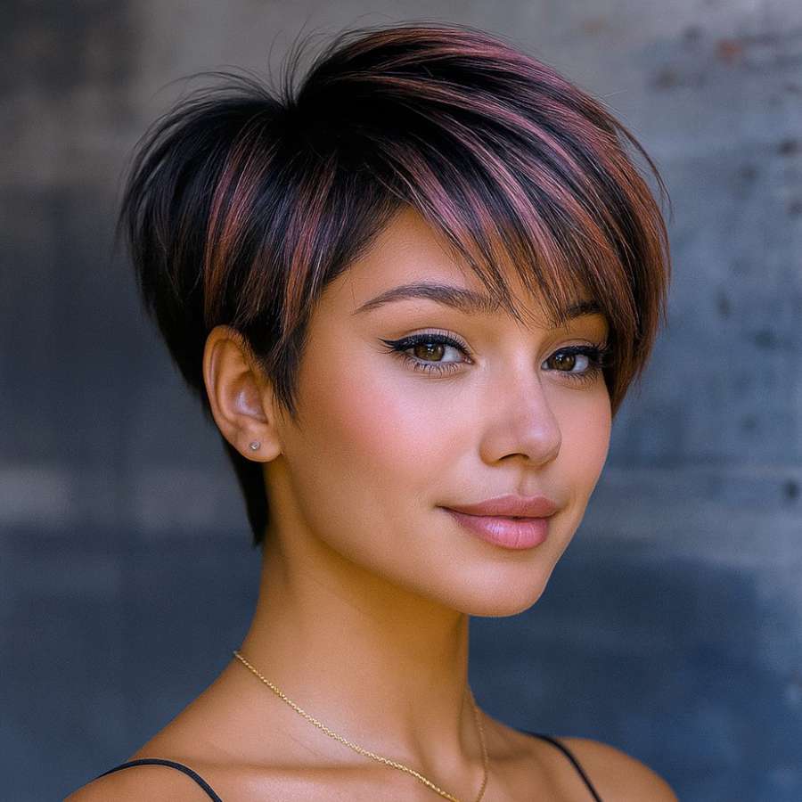 These short hairstyles showcase a stunning pixie cut enhanced with rose-tinted highlights and strategic layering. The combination of volume on top, tapered sides, and a sleek nape creates a flattering silhouette for many face shapes. The rose pink streaks add a bold, creative twist to the classic dark base, reflecting both personality and style. Each angle—from the sculpted back to the soft, eye-framing fringe—displays craftsmanship and flair. These cuts are ideal for women who value low-maintenance routines but don’t want to sacrifice fashion or edge. Whether in a professional setting or a social event, this hairstyle transitions effortlessly. Its structured elegance, softened by playful color, is a perfect example of modern femininity with confidence.