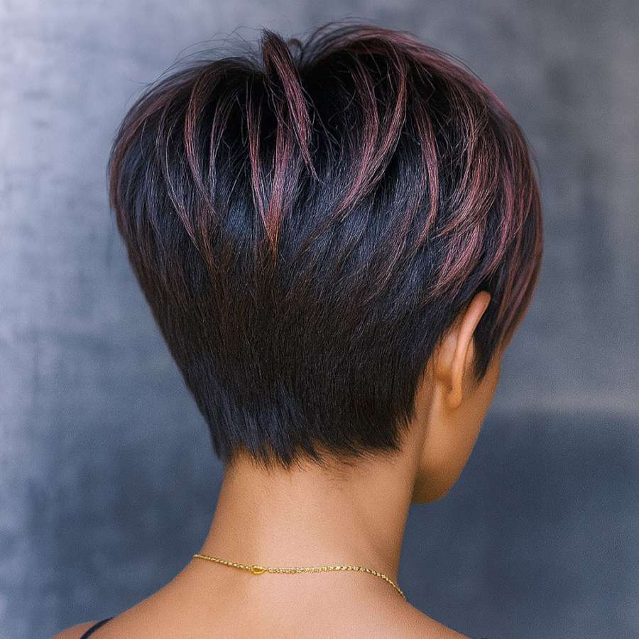 The back view of this pixie hairstyle reveals a masterclass in clean, layered design. Stacked precisely at the crown and softly tapered at the neck, it offers an elegant yet edgy shape that supports the front’s voluminous lift. Dark brown tones serve as the foundation, while hints of rose pink catch the light for a playful surprise. This kind of sculpting is ideal for showcasing a graceful neckline and posture. Maintenance is minimal but does require regular trims to retain the shape. It’s perfect for professionals or trendsetters who prefer their short style sleek and structured from every angle. Whether worn straight or tousled, the back holds its style effortlessly, delivering a confident, polished impression.