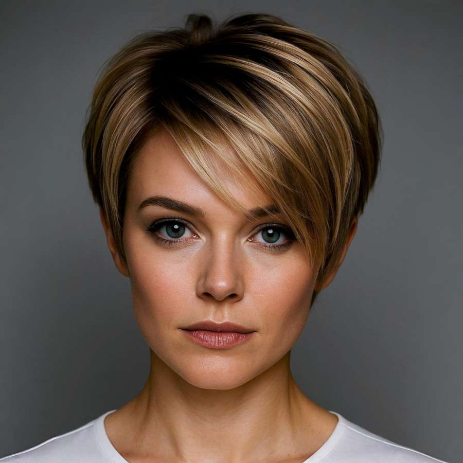This sleek pixie-bob cut features a perfect balance between sharp structure and soft femininity. The caramel blonde tones are enriched with subtle highlights, adding depth and warmth to the overall look. Precision layers are tailored to enhance volume at the crown while the longer side bangs frame the face beautifully, offering a chic and polished finish.