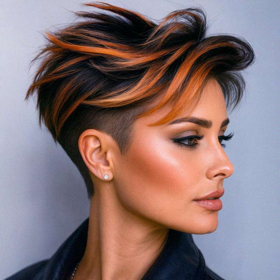 This bold undercut pixie is a masterpiece of contrast and edge. The sharply faded sides create a clean, sculpted base, while the voluminous top showcases striking copper highlights that add fiery dimension and motion to the dark base color.