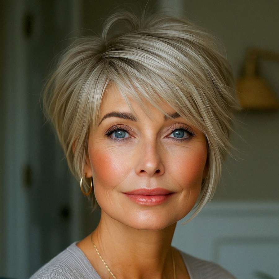 This elegant layered bob is the perfect balance of timeless beauty and modern sophistication. The soft ash blonde color adds a luminous glow, subtly enhancing skin tone and bringing out the brightness in the eyes. Carefully feathered layers create volume and texture without heaviness, giving the hair a natural lift and movement that flatters all angles. The side-swept fringe frames the face delicately, emphasizing cheekbones and softening the overall look. Ideal for fine to medium hair, this cut is both lightweight and easy to maintain, making it a favorite for women who value style with minimal effort. With just a bit of volumizing mousse and a round brush, this style can be worn polished or tousled for a more relaxed feel. It’s a graceful, age-defying choice for any occasion—from daily wear to special events.
