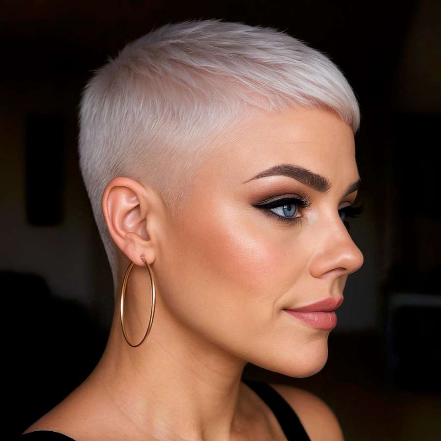 Seen from the right, the structured elegance of this pixie cut shines through. The precise tapering at the side frames the face cleanly, guiding the eye toward the cheekbone. The platinum shade enhances contrast, making skin tones pop and makeup stand out. This look is especially flattering for those with strong jawlines or pronounced brows. Its modern and refined edge makes it a perfect choice for professionals who want to maintain a trendy yet polished appearance.