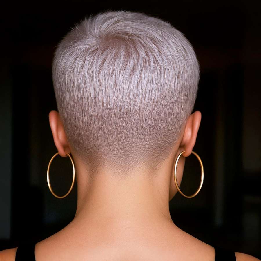 From behind, this pixie cut makes a lasting impression with its perfectly tapered nape. The back is cleanly blended, forming a subtle curve that elongates the neck and complements posture. The platinum tone reflects light evenly, highlighting the flawless finish. Great for those who value sleekness and structure, this look requires minimal upkeep and always appears polished. It’s a prime example of how simplicity and precision can achieve maximum style impact.
