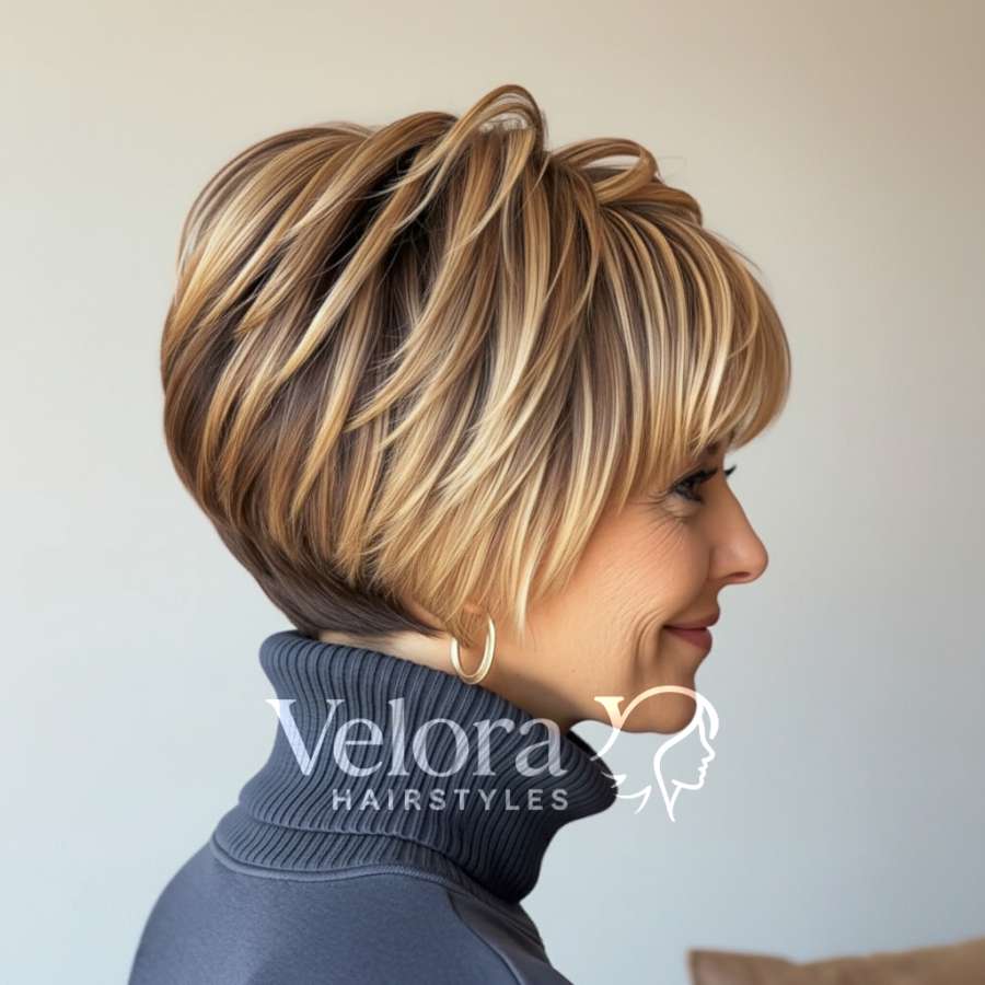 Viewed from the side, this golden layered bob reveals its expertly sculpted structure. The stacked layers at the back create natural lift, making the crown appear voluminous and full. The front gradually elongates toward the jawline, bringing focus to the facial features and providing a subtle slimming effect. The warm golden hue, interlaced with lighter honey and beige strands, adds a touch of glamour without being overpowering. The sleek flow of the layers makes it perfect for women who enjoy polished yet easy-to-style looks. Ideal for fine to medium hair textures, it holds shape well throughout the day. With a touch of styling cream or volumizing spray, you can effortlessly recreate this salon-perfect finish in minutes. A timeless choice that captures both grace and movement.