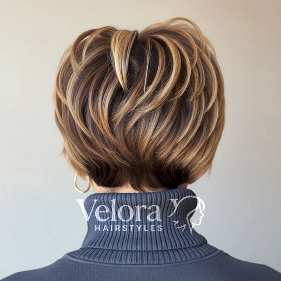 From the back, this honey-blonde stacked bob displays the artistry of modern short hair design. Each layer is precisely cut to build a natural curve that lifts the crown and tapers elegantly toward the neck. The contrast between the darker underlayers and lighter blonde streaks adds dynamic depth, giving the hair a radiant and healthy appearance. This cut not only looks stunning but also provides easy maintenance—its structured shape holds beautifully without constant restyling. It’s an excellent choice for women who prefer chic refinement and practicality in one. The seamless blend of colors enhances shine and complements various skin tones. Whether you’re heading to the office or a dinner night out, this hairstyle offers confidence and a polished silhouette from every angle.