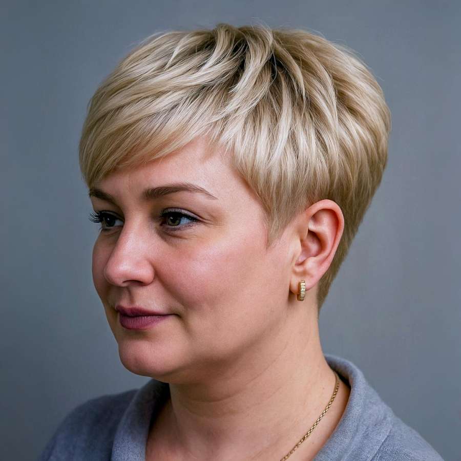 This elegant short hairstyle features a textured pixie cut that brings sophistication and ease together. Its creamy blonde color complements fair to medium skin tones, while the layered crown provides a fuller appearance from every angle. The side-swept bangs add softness and balance, perfect for round or oval faces. Styled with minimal effort, this haircut is ideal for women seeking a modern yet timeless look. Whether for professional settings or casual outings, it offers flexibility with a low-maintenance routine. A few tousled strokes or light styling cream can enhance the texture, making this a smart and stylish choice for those embracing short hair with confidence.