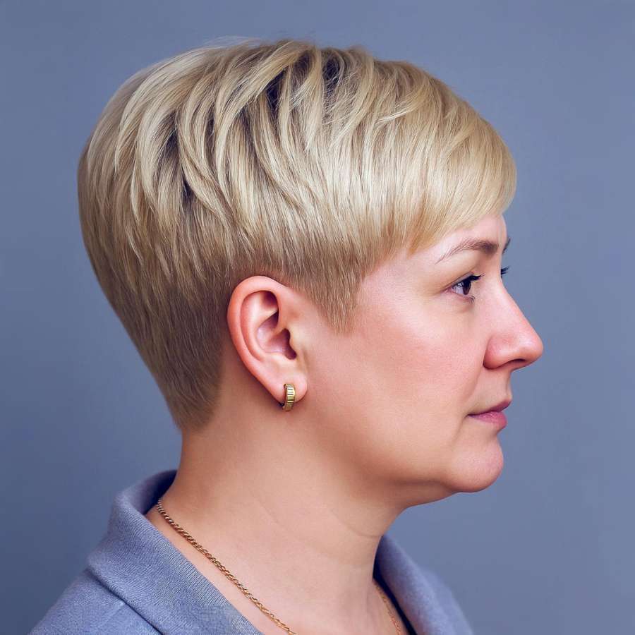 This side view highlights the structure and cleanliness of a well-executed pixie haircut. The neatly tapered nape and earline show precision and attention to detail. The blonde layers gently fall forward, creating a natural flow that accentuates the head shape. Ideal for women who appreciate clean lines and minimalist styles, this cut offers a crisp, confident look. The ear-exposing shape is excellent for showcasing earrings or other accessories. Its simplicity makes it perfect for everyday wear, while the refined silhouette offers enough elegance for formal occasions. A quick styling cream or serum is enough to maintain its sleek look throughout the day.