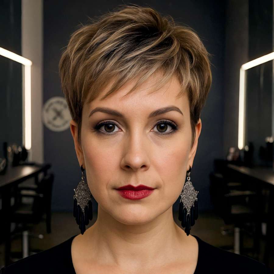 This front-facing pixie cut is the perfect balance between edgy and elegant. The feathered bangs softly frame the eyes, giving the look a feminine yet structured appearance. The subtle interplay of colors—cool blonde streaks against a warm brown base—creates depth and a sense of movement. This style works beautifully for women wanting a confident and stylish aesthetic that doesn’t require constant upkeep. Best suited for fine to medium hair, it brings out the eyes and cheekbones, making it an excellent choice for those looking to highlight facial features with a modern flair.