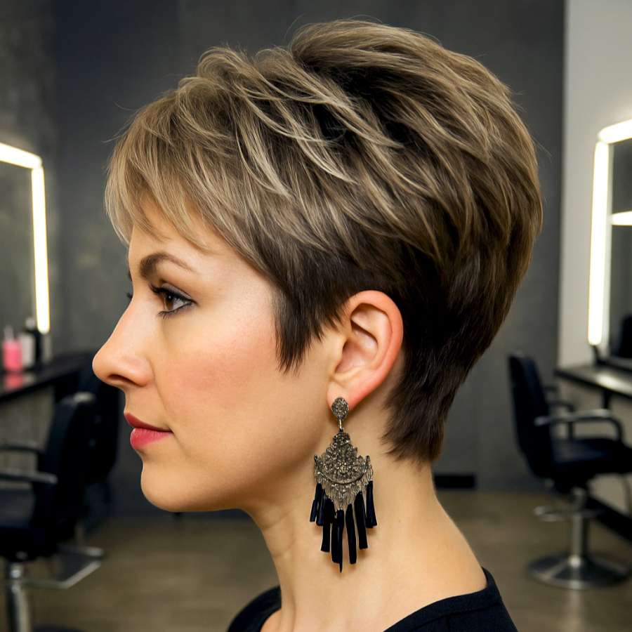 This side view emphasizes the graceful shape of a well-contoured pixie cut. It’s a style that seamlessly blends lighter blonde tones with darker lowlights, adding both texture and volume. The silhouette is neat and refined, hugging the natural contours of the head while maintaining a light and airy feel. This hairstyle is great for anyone who desires a short, manageable cut that retains its stylish form throughout the day. With minimal effort, this cut can look effortlessly fresh and modern—perfect for busy lifestyles that still demand a touch of glamour.
