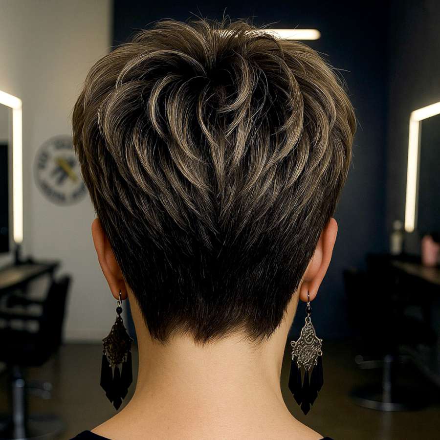 The back view of this hairstyle demonstrates the precision of a well-executed taper. The nape is closely trimmed for a neat finish, gradually transitioning into a fuller, layered crown. This style gives a lightweight, breathable feel that’s especially practical in warmer seasons. The textured crown adds height and visual interest, ensuring that the style looks polished from every angle. Women seeking a confident, contemporary short haircut that’s stylish yet professional will find this look ideal. It also pairs wonderfully with bold earrings or statement accessories to further elevate the silhouette.