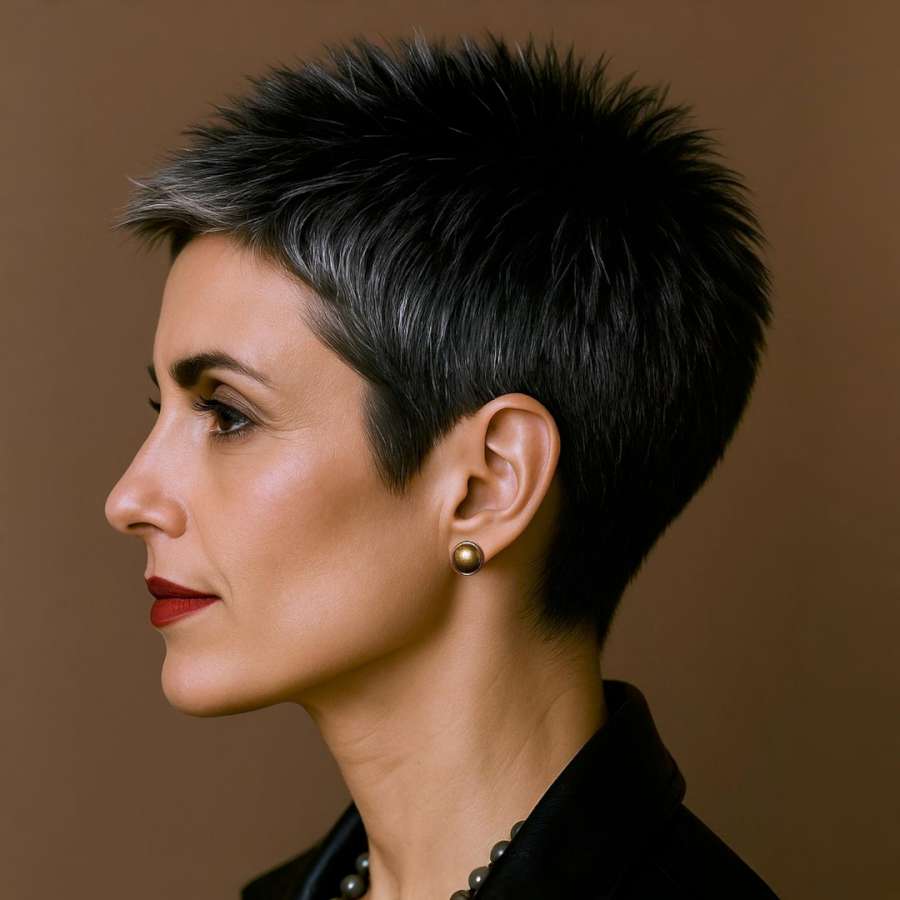 This sleek side-profile pixie showcases how a precision cut can elevate a minimalist style into a standout statement. The hair hugs the head’s natural shape, with gentle layering that provides structure without adding bulk. The blend of dark charcoal and ash-gray highlights brings sophistication and depth, perfectly framing the face. The forward-styled front pieces give a soft contrast to the cleanly shaved neck and sides. Perfect for women seeking a polished, professional look with a modern flair, this hairstyle works beautifully with sharp tailoring, such as leather or structured blazers. It’s low-fuss but highly impactful, making it ideal for active lifestyles or busy professionals.