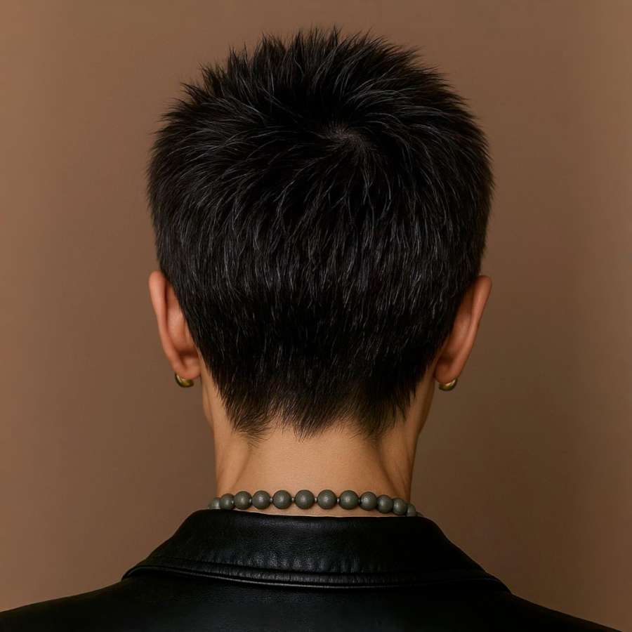 The back view of this pixie cut reveals a masterclass in technical hairstyling. The close-cropped nape transitions smoothly into a fuller crown, demonstrating careful tapering that enhances head shape and provides natural lift. The clean neckline keeps the style crisp and low-maintenance, ideal for those seeking a put-together look with minimal styling effort. Whether viewed from the front, side, or back, this hairstyle maintains a consistent, elegant structure. It’s an excellent choice for professional women, fashion-forward individuals, and anyone who values simplicity and sharp lines.