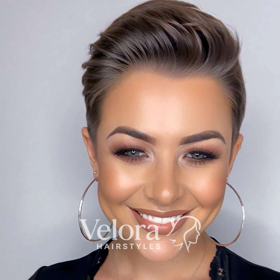 This pixie cut radiates confidence and grace from every angle. The voluminous top adds height and sophistication, while the neat undercut keeps the overall style crisp and modern. The glossy brunette shade with soft highlights enhances depth and movement, complementing the wearer’s complexion beautifully. This look is ideal for women who want to maintain short hair without sacrificing glamour. The clean hairline around the temples frames the face naturally, drawing attention to the eyes and cheekbones. Styled with a lightweight mousse or volumizing powder, the top layers can be shaped for a soft lift or a sleek polished look. This cut captures the essence of modern femininity — bold, confident, and effortlessly chic.
