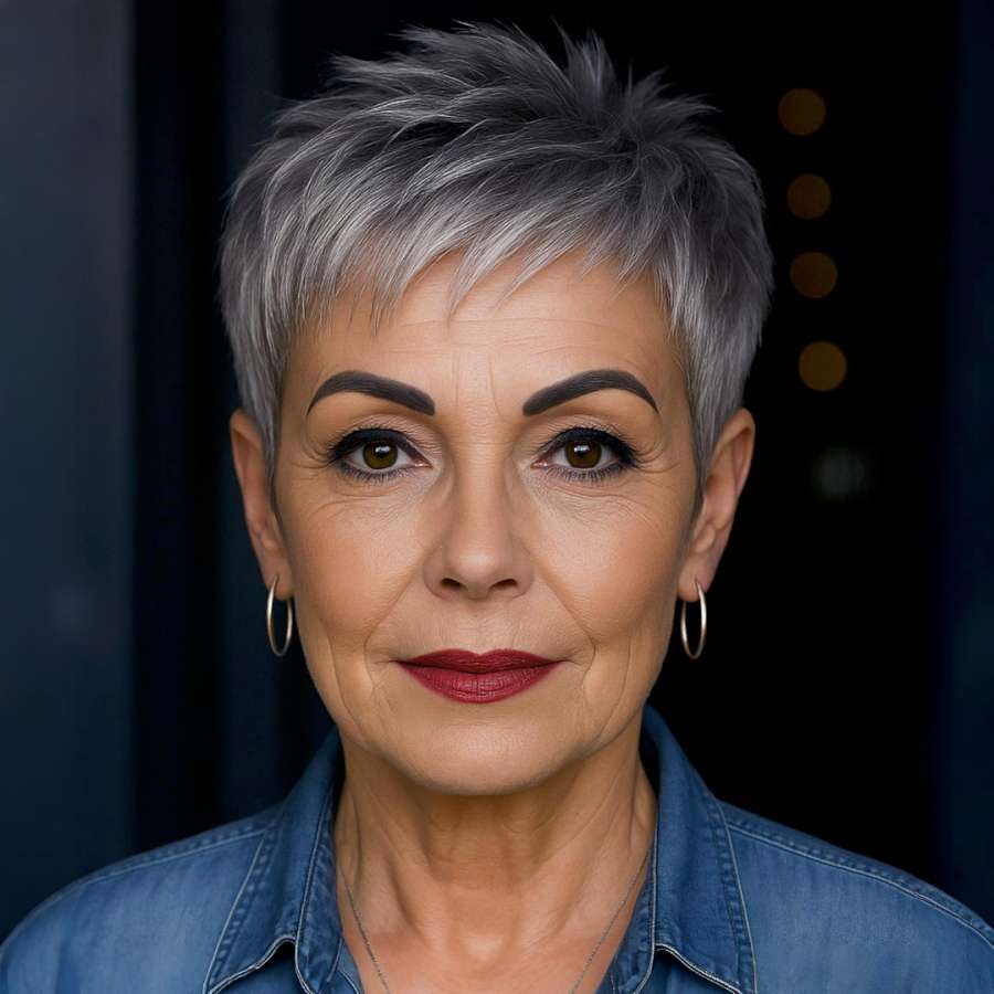 This front-facing pixie showcases symmetry, sharp lines, and a sleek texture that gives off a polished and sophisticated appearance. The hair is cut evenly with a subtle forward-facing fringe, offering clean geometry that flatters a range of face shapes. Paired with bold makeup — particularly strong brows and classic red lips — this look exudes strength and confidence. The silver shade is flattering and fashion-forward, harmonizing with cool skin undertones. This cut is especially well-suited for professional settings or formal occasions, yet its simplicity allows for day-to-day wear with ease. With just a bit of wax or styling paste, you can refresh this look daily. It’s a perfect option for women over 50 who want something stylish yet easy to maintain.