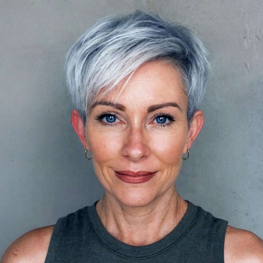 This front-facing view captures the essence of a refined, confident look. The pixie cut is tailored with precision, bringing focus to the facial features and enhancing the cheekbones. The volume at the top is achieved through carefully blended layers that are subtly tousled for a natural lift. The silvery-white hair color introduces a sophisticated edge, offering both grace and trend-conscious energy. The hairline is cleanly cut, with a light fringe falling softly over the forehead, balancing structure and softness. This hairstyle is perfect for women seeking a bold yet graceful transformation. It suits mature women exceptionally well but also flatters younger individuals who prefer low-maintenance yet fashion-forward hair. Best styled with a volumizing mousse or texture spray, this cut holds its form effortlessly throughout the day.