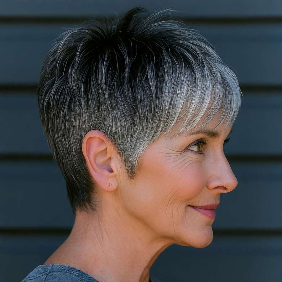 From this side view, the pixie cut reveals its sculpted precision. The hair is cropped neatly at the nape and ears while gradually blending into the longer top. This tapered design gives the cut a sleek, polished finish without looking stiff. The side-swept strands on top add softness and movement, which keeps the look airy and dynamic. The silver color is multidimensional, with natural grays and soft white streaks creating visual depth. This hairstyle complements a variety of fashion choices and requires minimal daily maintenance, making it ideal for those with an active lifestyle. It’s particularly flattering for women with defined cheekbones and a graceful neckline. Add a lightweight styling mousse to give volume to the crown, or let it fall naturally for a more relaxed effect.