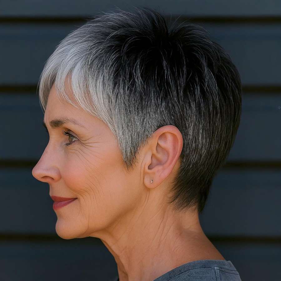 The left profile of this pixie cut reveals the smooth transition and refined layering that define this elegant style. The hair hugs the contours of the head beautifully, with gentle curves that enhance the natural shape of the skull. The fine detailing around the ear and nape gives it a salon-fresh finish, while the silver-gray color offers a graceful, age-embracing vibe. This haircut doesn’t rely on volume for impact—it impresses with its precision and texture. Ideal for women who prefer a tidy, sophisticated appearance, it works well with both professional attire and relaxed everyday outfits. Easy to wash, dry, and go, it’s perfect for women who prioritize ease without compromising style.