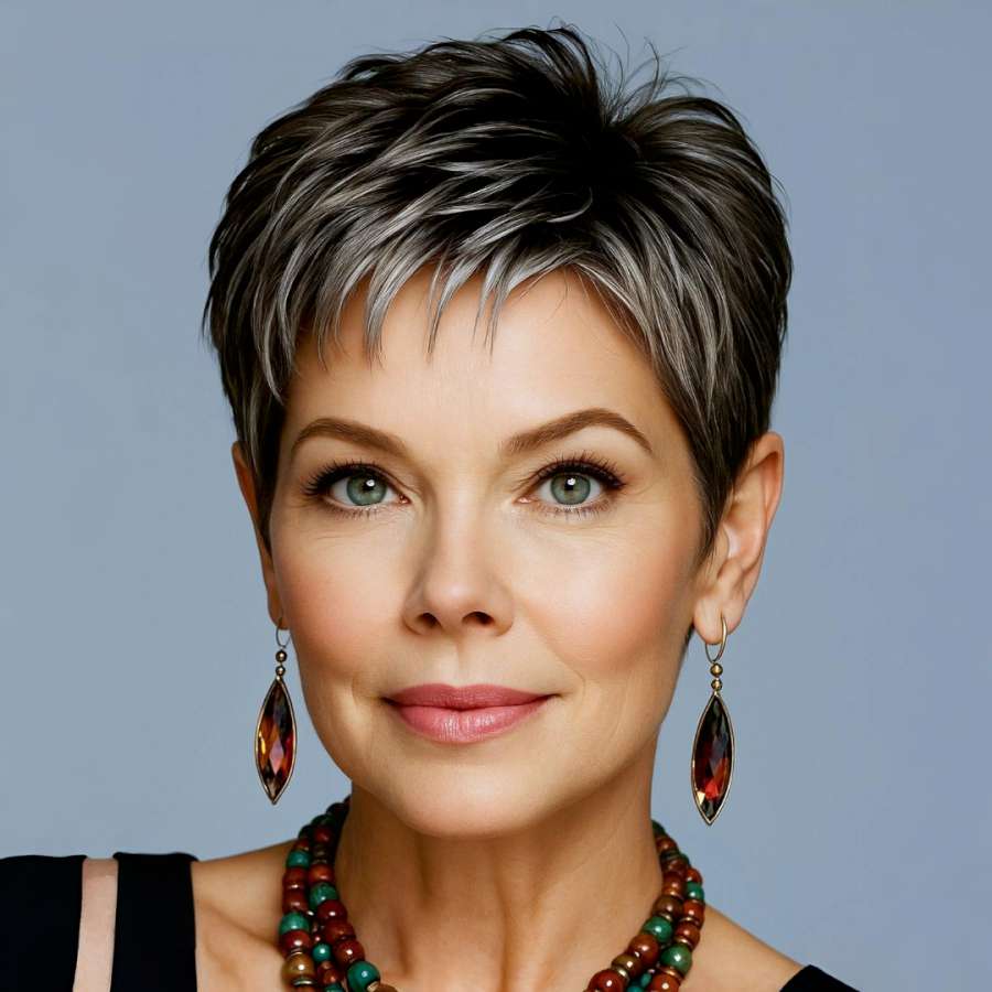This sophisticated textured pixie cut showcases expertly layered strands that add volume and movement throughout the crown. The soft silver highlights blended into a darker base create a striking contrast, giving the style depth and vibrancy. Light fringe around the forehead softens the overall look, flattering a variety of face shapes. Ideal for mature women who prefer a modern, elegant appearance with minimal styling effort, this haircut radiates polish and confidence. Perfect with statement earrings or bold accessories, it’s a timeless yet fashion-forward choice.