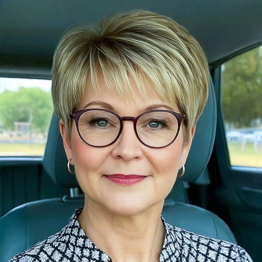 This soft blonde pixie cut is a refined and practical hairstyle ideal for women seeking a polished yet youthful appearance. The neatly layered crown adds subtle volume, while the side-swept fringe frames the face with grace. Light golden tones enhance warmth and luminosity, perfectly complementing fair to medium skin tones. This cut is low-maintenance but never boring—it balances professionalism with approachability. Ideal for women who wear glasses, the clean silhouette allows facial features to shine without overpowering the frame. Whether for work or casual days, it’s an elegant, timeless choice.