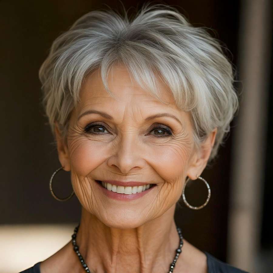 This textured gray pixie cut is a beautiful blend of sophistication and ease, ideal for mature women embracing their natural silver tones. The soft, feathery layers create movement and dimension, while the subtle fringe gently frames the face, adding a touch of youthfulness. The volume at the crown enhances the shape of the head and flatters a variety of face shapes. Perfect for low-maintenance styling, this cut is both timeless and empowering—highlighting confidence, natural beauty, and a graceful sense of style. A go-to look for everyday elegance.