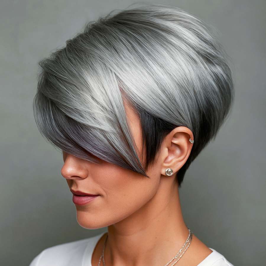 This bold and futuristic asymmetrical pixie cut is a true showstopper. The striking contrast between the metallic silver top and the deep black underlayer adds dramatic depth and dimension. With long, sweeping bangs that artfully conceal one eye, this style delivers mystery and high-fashion flair. Perfect for those who want to express individuality and confidence, this sharp-edged cut is polished to perfection with a sleek finish. Ideal for fashion-forward personalities who love to stand out with elegance and edge.