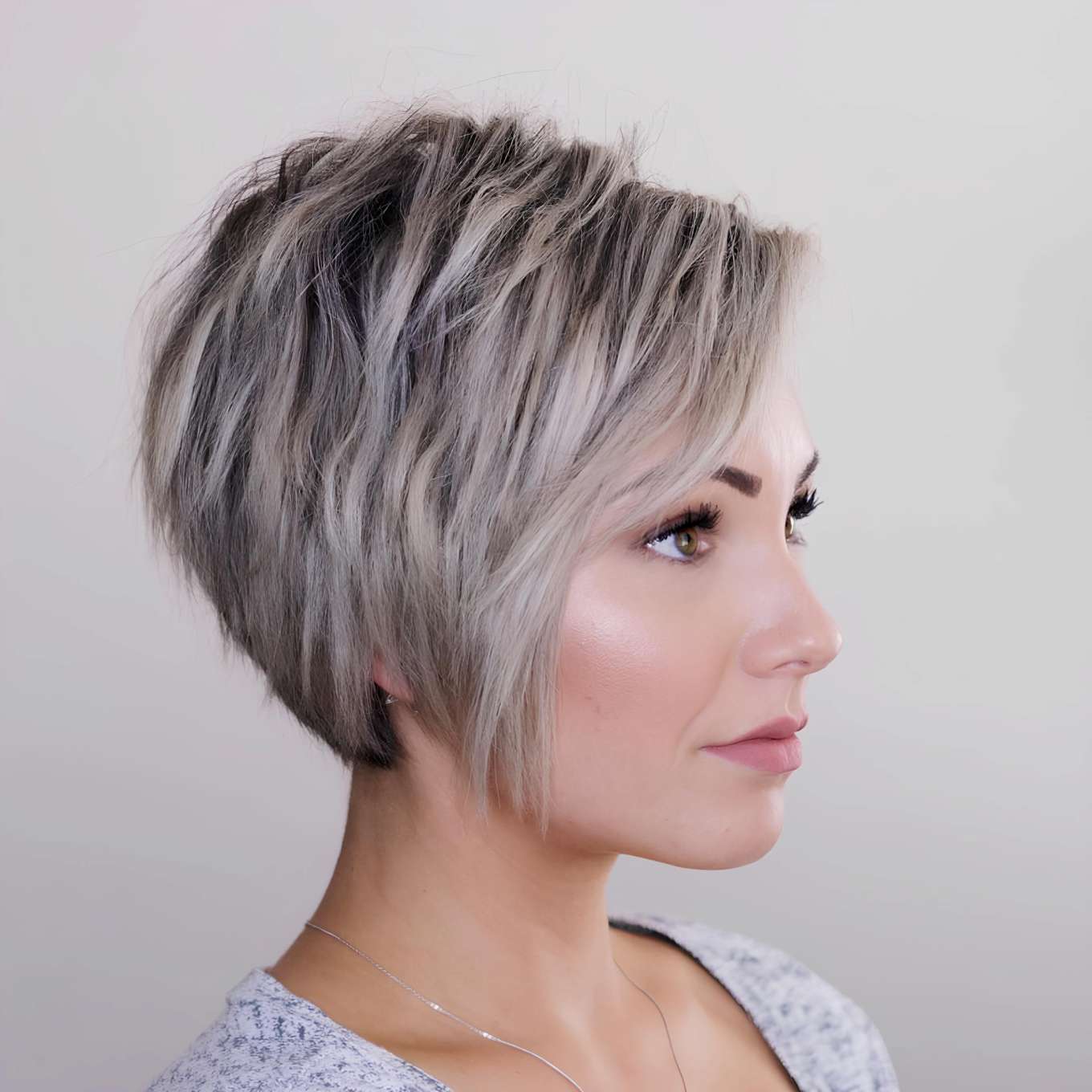 The fifth image features a chic silver bob with subtle layers, offering a sophisticated and trendy look. The silver hair color is modern and fashionable, adding a unique twist to the classic bob. The subtle layers provide movement and texture, making the hairstyle appear effortless yet stylish. This bob is ideal for women who want a contemporary look that is both elegant and easy to maintain.